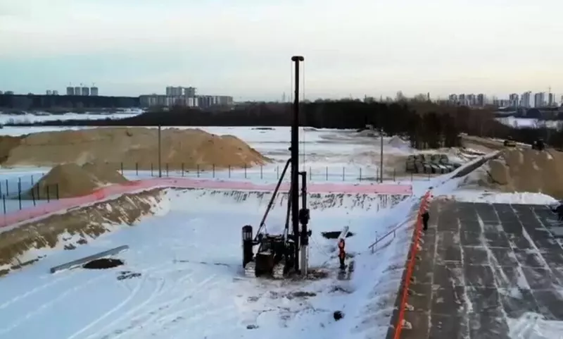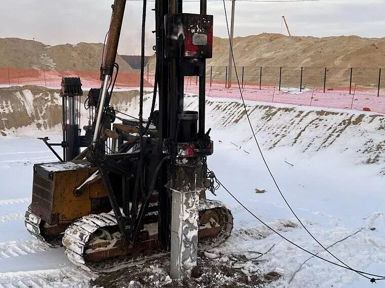 Застройщик предварительно провел испытания свай. Выполнена разработка котлована на проектную отметку, с которой производится погружение основного количества свай — это почти 400 штук.